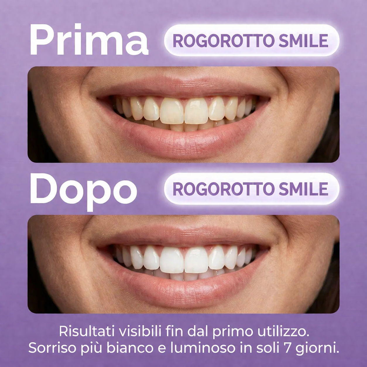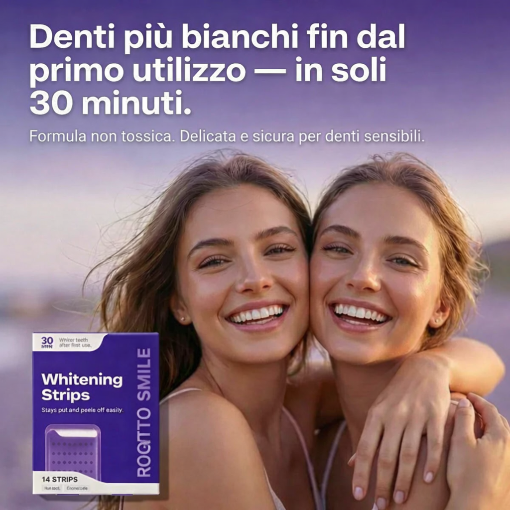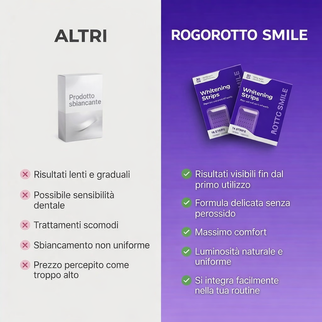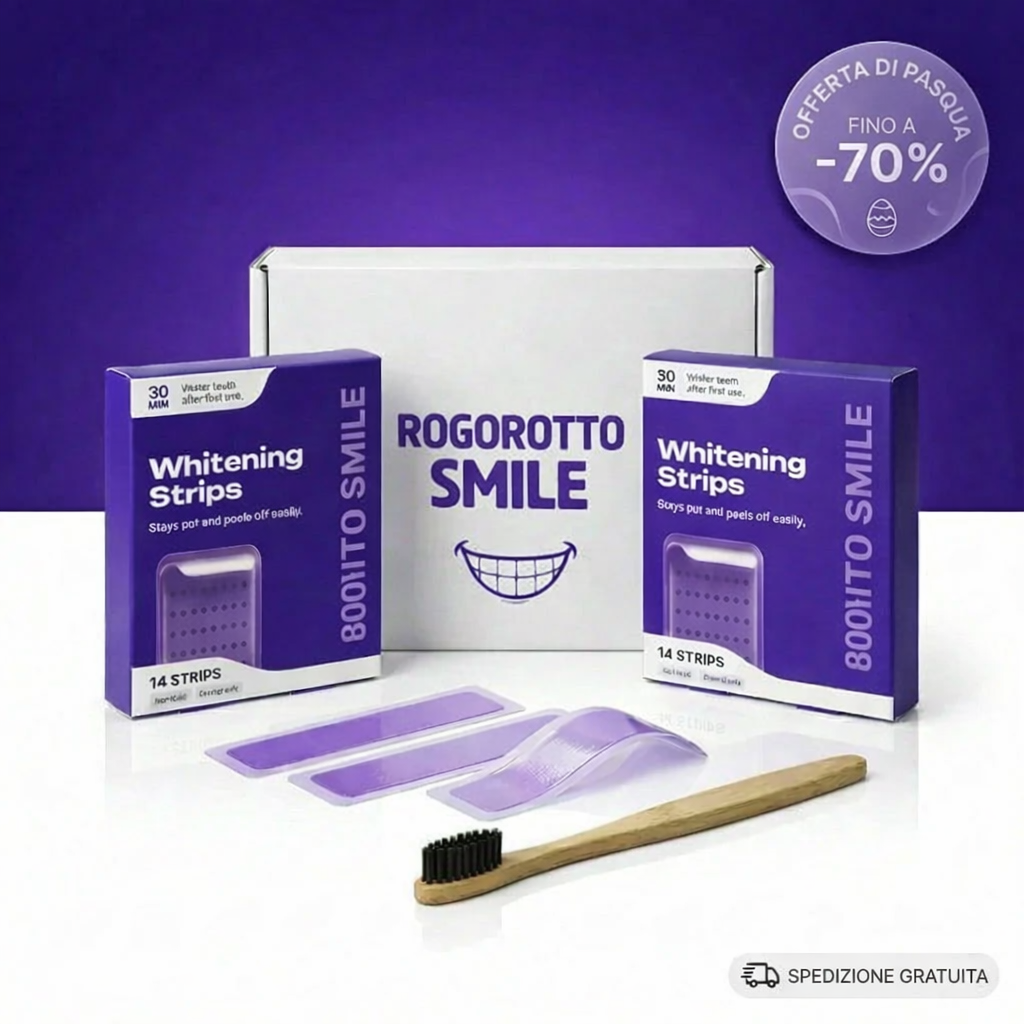 Scopri le strisce sbiancanti viola ROGOROTTO SMILE. Una rivoluzione nell'istantaneità che offre risultati visibili nel momento stesso in cui le togli.